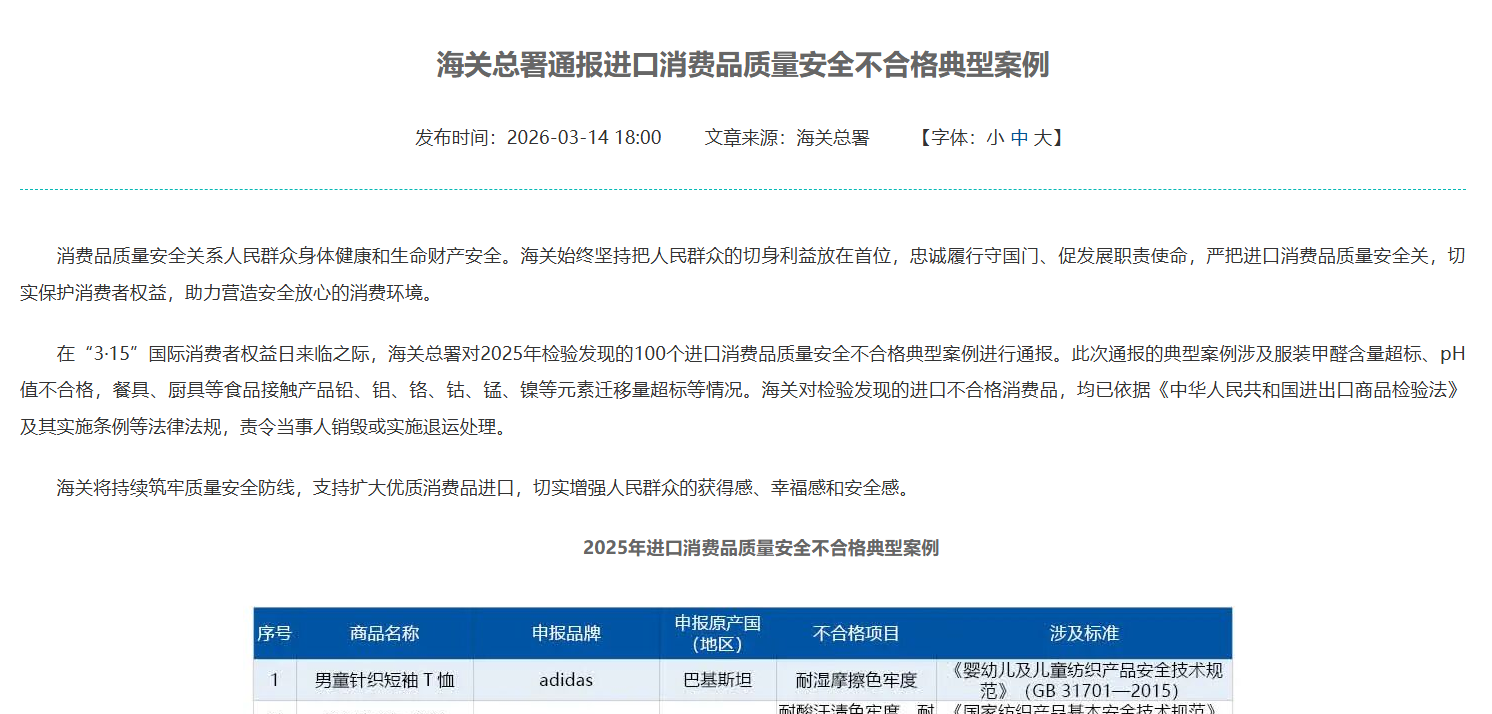 在“3·15”国际消费者权益日来临之际,海关总署对2025年检验发现的100个进口消费品质量安全不合格典型案例进行通报。此次通报的典型案例涉及服装甲醛含量超标、pH值不合格,餐具、厨具等食品接触产品铅、铝、铬、钴、锰、镍等元素迁移量超标等情况。海关对检验发现的进口不合格消费品,均已依据《中华人民共和国进出口商品检验法》及其实施条例等法律法规,责令当事人销毁或实施退运处理。